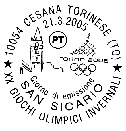 raffigura, su fondo bianco tra due elementi grafici, scorci di monumenti rappresentativi di alcune località che ospiteranno i XX Giochi Olimpici Invernali "Torino 2006" e precisamente Cesana Torinese - frazione San Sicario con il campanile della Chiesa romanica di San Giovanni Battista. Completano il francobollo la riproduzione del logo "TORINO 2006", la leggenda "XX GIOCHI OLIMPICI INVERNALI", la rispettiva località "CESANA TORINESE SAN SICARIO", la scritta "ITALIA" ed il valore "€ 0,45".