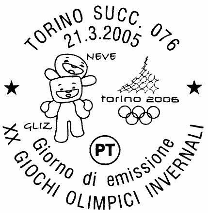 raffigura, su fondo bianco tra due elementi grafici, scorci di monumenti rappresentativi di alcune località che ospiteranno i XX Giochi Olimpici Invernali "Torino 2006" e precisamente su un fondino giallo, il logo e le mascotte "NEVE" e "GLIZ"; in un fumetto è riportata la scritta "CI VEDIAMO AI GIOCHI!". Completano il francobollo la scritta "ITALIA" ed il valore "€ 0,60".