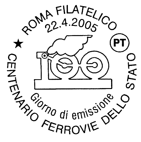 riproduce il bozzetto vincitore del concorso indetto dalle Ferrovie dello Stato e dal Ministero delle Comunicazioni per la realizzazione di un francobollo dedicato al centenario dell'istituzione delle Ferrovie dello Stato e raffigura, su fondo bianco, il numero '100' a rappresentare una locomotiva a vapore posta idealmente su un binario che riporta la leggenda "CENTENARIO FERROVIE DELLO STATO". Completano il francobollo la scritta "ITALIA" ed il valore "€ 0,45".