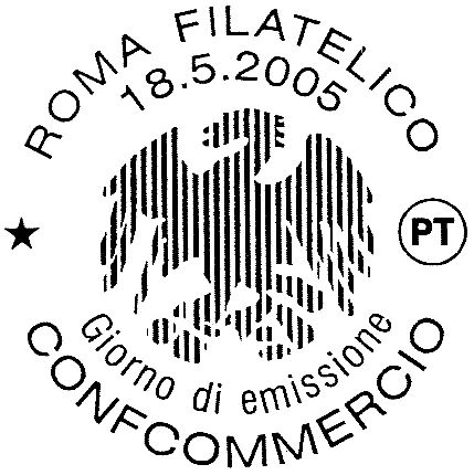 entro una cornice grigia è raffigurato il logo della Confcommercio, su un fondino caratterizzato da un motivo geometrico lineare. Completano il francobollo la leggenda "CONFCOMMERCIO", le date "1945" e "2005", la scritta "ITALIA" ed il valore "€ 0,60"