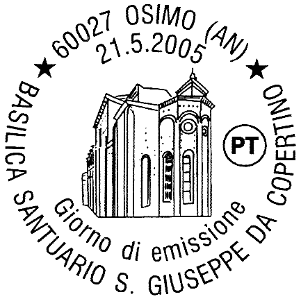 raffigura l'abside della Basilica-Santuario San Giuseppe da Copertino, in Osimo, con le caratteristiche finestre ad arco trilobato. Completano il francobollo le leggende "BASILICA", "SANTUARIO S.GIUSEPPE DA COPERTINO" e "OSIMO", la scritta "ITALIA" ed il valore "€ 0,45"