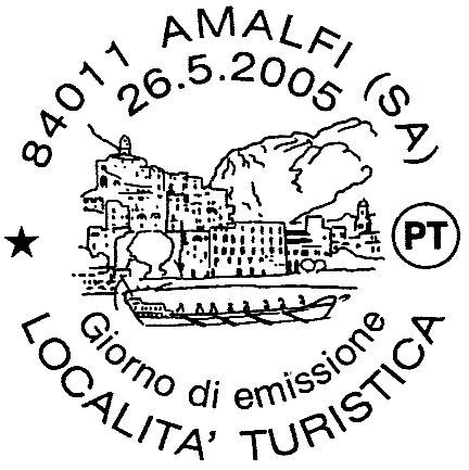 riproduce, entro una cornice lineare, una veduta pittorica della località prescelta e precisamente: Amalfi: il panorama della città vista dal mare e, in primo piano, la caratteristica imbarcazione che partecipa, ogni quattro anni, alla storica Regata delle Antiche Repubbliche Marinare. Completano il francobollo la rispettiva leggenda "AMALFI", la scritta "ITALIA" ed il valore "€ 0,45"