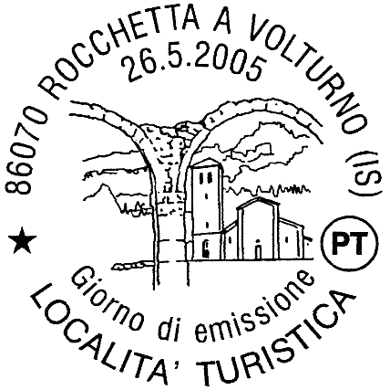 riproduce, entro una cornice lineare, una veduta pittorica della località prescelta e precisamente: Rocchetta a Volturno: l'Abbazia di San Vincenzo, i resti degli antichi archi della vecchia Chiesa e sullo sfondo è riportata una veduta del paese. Completano il francobollo la rispettiva leggenda "ROCCHETTA A VOLTURNO", la scritta "ITALIA" ed il valore "€ 0,45".