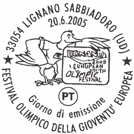 raffigura su una simbolica riva del mare il gabbiano "Coki", mascotte della manifestazione sportiva "Lignano 2005", idealmente poggiato sul logo dell'VIII Festival Olimpico della Gioventù Europea, che si svolge a Lignano Sabbiadoro dal 3 all'8 luglio 2005. Completano il francobollo la leggenda "FESTIVAL OLIMPICO DELLA GIOVENTù EUROPEA", la scritta "ITALIA" ed il valore "€ 0,62".