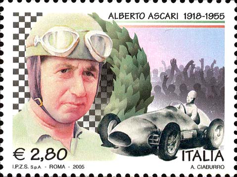 raffigura, in primo piano a sinistra, un ritratto di Alberto Ascari affiancato da un'auto da corsa d'epoca, idealmente guidata dal pilota; sullo sfondo è rappresentato il profilo di un pubblico festante, alcuni particolari di una corona d'alloro e della bandiera a scacchi, che segnala il traguardo nelle gare automobilistiche. In alto a destra sono riportati i colori della bandiera italiana. Completano il francobollo la leggenda "ALBERTO ASCARI 1918-1955", la scritta "ITALIA" ed il valore "€ 2,80".