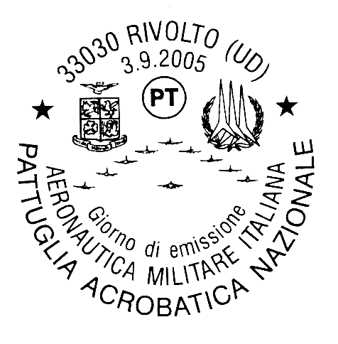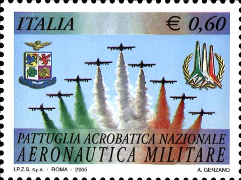 rappresenta immagini del volo acrobatico dei velivoli della Pattuglia Acrobatica Nazionale dell'Aeronautica Militare Italiana e in particolare raffigura: il Tricolore più lungo del mondo steso dai fumi di nove velivoli delle "Frecce Tricolori", al termine di ogni esibizione. Completano il francobollo lo stemma dell'Aeronautica Militare Italiana e il logo delle Frecce Tricolori, riprodotti rispettivamente a sinistra e a destra, la scritta "PATTUGLIA ACROBATICA NAZIONALE" e "AERONAUTICA MILITARE", la scritta "ITALIA" ed il relativo valore "€ 0,60".
