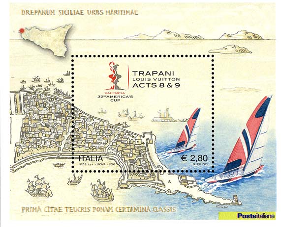 il francobollo è impresso in un riquadro perforato posto al centro del foglietto. Fuori dal riquadro il disegno prosegue il disegno del francobollo; in alto a sinistra è raffigurato il profilo della regione Sicilia dove è evidenziata la città di Trapani e in basso a destra è ripetuta l'immagine ingrandita della barca da regata. Completano il foglietto le scritte "DREPANUM SICILIAE URBS MARITIMAE" e "PRIMA CITAE TEUCRIS PONAM CERTAMINA CLASSIS" e in basso a destra la riproduzione del logo di Poste Italiane