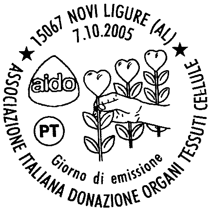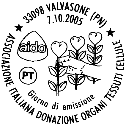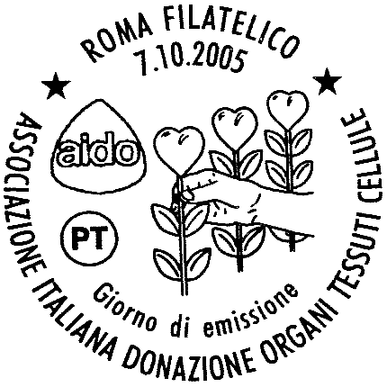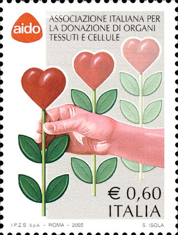 raffigura una mano che coglie un fiore con la corolla a forma di cuore, rappresentato in sequenza altre due volte, in colori più tenui; in alto a sinistra è riportato il logo "AIDO". Completano il francobollo la leggenda "ASSOCIAZIONE ITALIANA PER LA DONAZIONE DI ORGANI TESSUTI E CELLULE", la scritta "ITALIA" ed il valore "€ 0,60"
