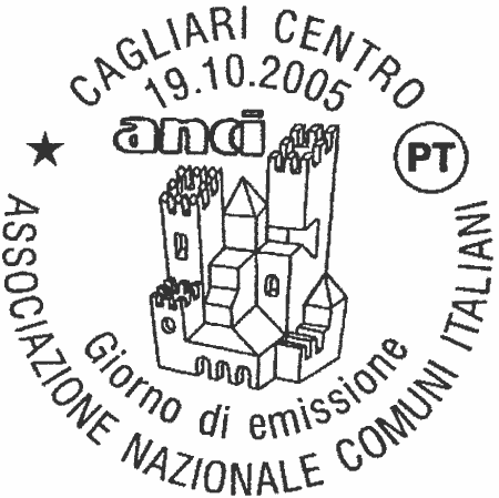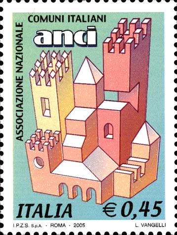 raffigura una interpretazione grafica tridimensionale del logo "ANCI". Completano il francobollo la leggenda "ASSOCIAZIONE NAZIONALE COMUNI ITALIANI", la scritta "ITALIA" ed il valore "€ 0,45".