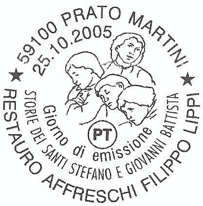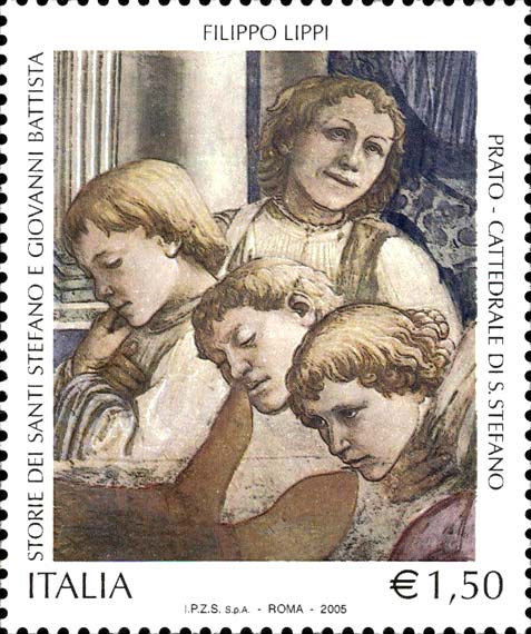riproduce un particolare degli affreschi del ciclo pittorico "Storie dei Santi Stefano e Giovanni Battista" realizzati da Filippo Lippi dal 1452 al 1465 nella Cappella Maggiore della Cattedrale di Santo Stefano, in Prato. Completano il francobollo le leggende "STORIE DEI SANTI STEFANO E GIOVANNI BATTISTA", "FILIPPO LIPPI" e "PRATO - CATTEDRALE DI S.STEFANO", la scritta "ITALIA" ed il rispettivo valore.
