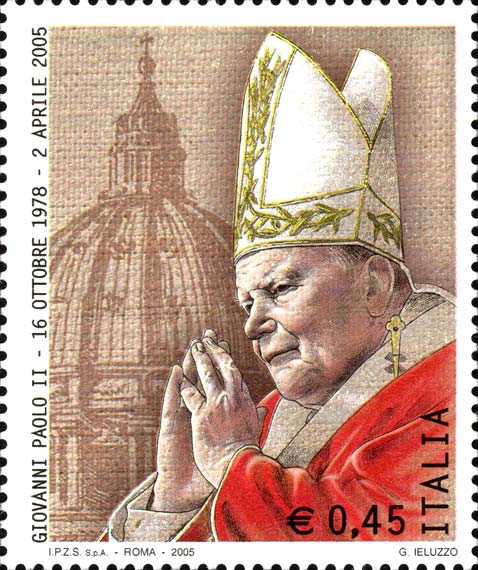 riproduce un'immagine di Papa Giovanni Paolo II in preghiera, a sinistra del francobollo è raffigurato un particolare della Cupola della Basilica di San Pietro. Completano il francobollo le rispettive leggende "GIOVANNI PAOLO II - 16 OTTOBRE 1978 - 2 APRILE 2005", la scritta "ITALIA" ed il rispettivo valore "€ 0,45".