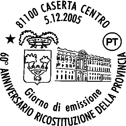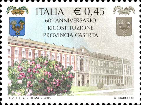 raffigura la facciata principale della Reggia di Caserta, sede della cerimonia di inaugurazione delle celebrazioni per il 60° anniversario della ricostituzione della Provincia di Caserta; in alto a sinistra è riprodotto lo stemma della Provincia di Caserta, ripetuto a destra con effetto monocromatico. Completano il francobollo la leggenda "60° ANNIVERSARIO RICOSTITUZIONE PROVINCIA CASERTA", la scritta "ITALIA" ed il valore "€ 0,45"