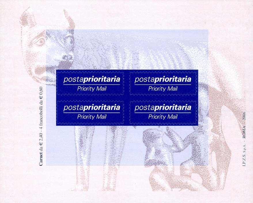 * in quarta di copertina, su fondo che raffigura la Lupa, simbolo di Roma, sono disposte all'interno di un riquadro bleu, quattro etichette autoadesive recanti in negativo le scritte "postaprioritaria" e "Priority Mail"; all'esterno del riquadro sono riportate le scritte "Carnet da € 2,40 - 4 francobolli da € 0,60";