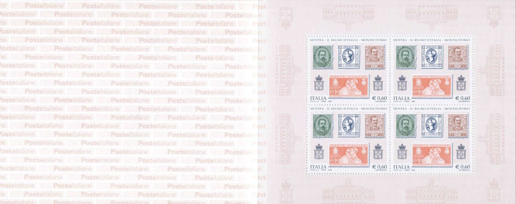 * in prima di copertina, su fondo che raffigura la facciata stilizzata di Palazzo di Montecitorio, sono riprodotti, sovrapposti, in diagonale da sinistra a destra i tre francobolli i cui colori rappresentano la bandiera italiana, a destra il francobollo dedicato alle nozze del Principe Umberto e in basso a sinistra il logo di Poste Italiane; inoltre sono riportate rispettivamente in alto e in basso le leggende "IL REGNO D'ITALIA NELLA POSTA E NELLA FILATELIA" e "ROMA - SALA DELLA LUPA DI MONTECITORIO - 9 / 16 FEBBRAIO 2006";