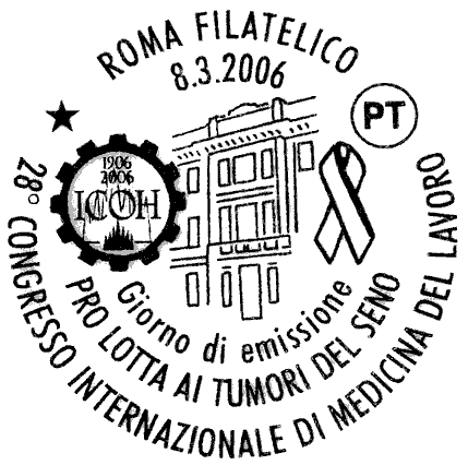 raffigura, sullo sfondo, il palazzo sede della Clinica del Lavoro "Luigi Devoto', in Milano; in primo piano a sinistra sono riprodotti, in alto, il logo del "28° CONGRESSO INTERNAZIONALE DI MEDICINA DEL LAVORO" e, in basso, il logo di Fiera Milano Congressi Center; a destra è riportato il fiocco rosa, simbolo universale della lotta ai tumori del seno. Completano il francobollo la scritta "ITALIA" il valore "€ 0,60 + € 0,30" con la dicitura " PRO LOTTA AI TUMORI DEL SENO"