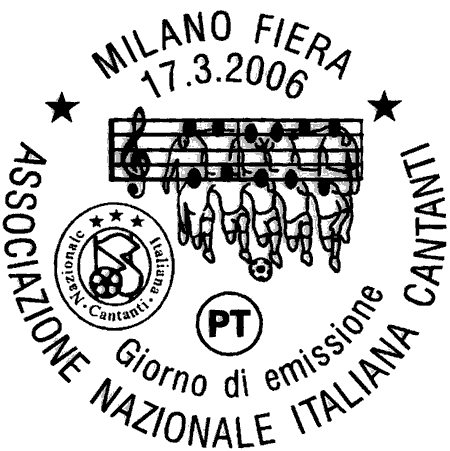 rappresenta, in grafica stilizzata, undici giocatori di una squadra di calcio i cui volti formano idealmente le note di un pentagramma; in basso a sinistra è riprodotto il logo dell'Associazione Nazionale Italiana Cantanti. Completano il francobollo la scritta "ITALIA" e il valore "€ 0,45"