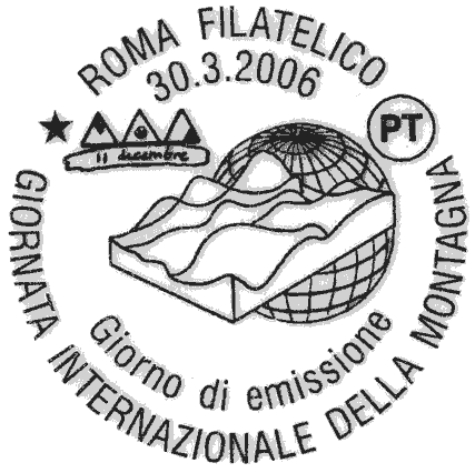 rappresenta, in grafica stilizzata, una veduta tridimensionale di montagna che emerge dal globo terrestre, in alto a sinistra è riprodotto il logo della "GIORNATA INTERNAZIONALE DELLA MONTAGNA", che si celebra ogni anno in tutto il mondo l'11 dicembre. Completano il francobollo la scritta "ITALIA" ed il valore "€ 0,60"