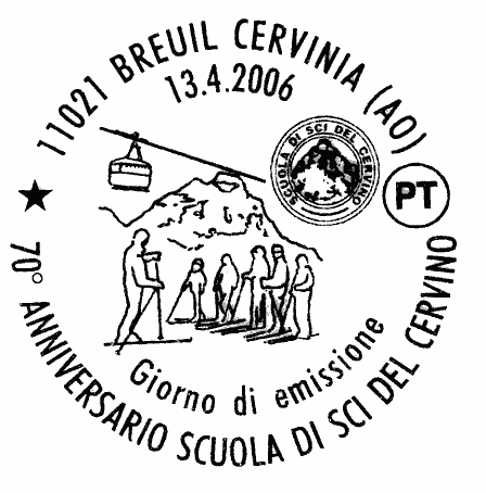 rappresenta un maestro della Scuola di sci del Cervino con alcuni allievi durante una lezione e, sullo sfondo, sono raffigurati la funivia e il Monte Cervino; in alto a destra è riprodotto lo stemma della Scuola. Completano il francobollo la leggenda "70º ANNIVERSARIO SCUOLA DI SCI DEL CERVINO", la scritta "ITALIA" ed il valore "€ 0,45"