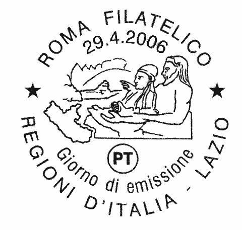 è delimitata in alto e a sinistra da una fascia tricolore che riproduce, all'interno di un occhiello, lo stemma della relativa regione e rappresenta: è riprodotto, a destra, un particolare del Sarcofago degli Sposi, conservato presso il Museo Nazionale Etrusco di Valle Giulia, in Roma; sullo sfondo sono raffigurati la necropoli etrusca di Cerveteri e in basso il profilo della Regione Lazio. Completano il francobollo la rispettiva leggenda "PIEMONTE", la scritta "ITALIA" ed il valore "€ 0,45".