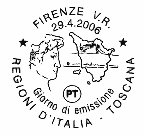 è delimitata in alto e a sinistra da una fascia tricolore che riproduce, all'interno di un occhiello, lo stemma della relativa regione e rappresenta: è riprodotto, a sinistra, un particolare della statua "David" realizzata da Michelangelo e attualmente conservata presso la Galleria dell'Accademia, in Firenze; sullo sfondo è raffigurato un paesaggio sul quale è delineato il profilo della Regione Toscana. Completano il francobollo la rispettiva leggenda "PIEMONTE", la scritta "ITALIA" ed il valore "€ 0,45".