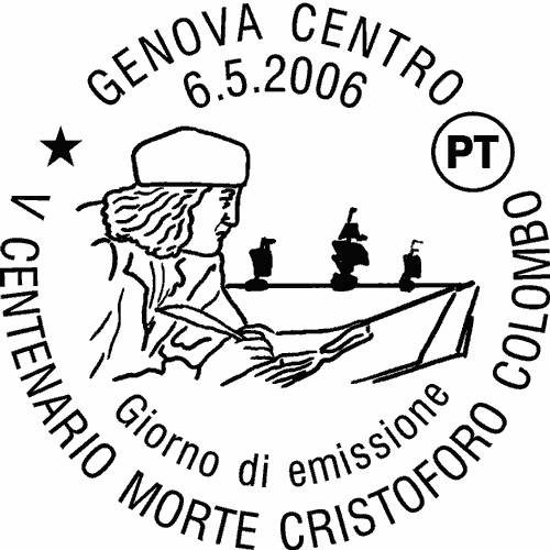 raffigura, in primo piano, un'immagine di Cristoforo Colombo, idealmente impegnato a redigere il diario di bordo e, sullo sfondo, le sagome delle tre caravelle. Completano il francobollo la leggenda "CRISTOFORO COLOMBO V CENTENARIO DELLA MORTE", la scritta "ITALIA" ed il valore "€ 0,62"