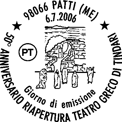 riporta, sullo sfondo, alcuni resti del Teatro Greco di Tindari, il Mar Tirreno ed il profilo di una delle Isole Eolie; in primo piano sono raffigurati, in grafica stilizzata, degli attori impegnati in una rappresentazione teatrale classica. Completano il francobollo la leggenda "50º ANNIVERSARIO RIAPERTURA DEL TEATRO GRECO DI TINDARI", la scritta "ITALIA" ed il valore "€ 1,50"