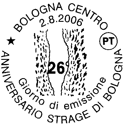 rappresenta, idealmente, lo squarcio provocato dall'esplosione della bomba collocata nella sala d'attesa di seconda classe della stazione ferroviaria di Bologna, il 2 agosto 1980; al centro è riportato il numero "26º", a ricordo gli anni trascorsi dalla strage. Completano il francobollo le leggende "ANNIVERSARIO STRAGE DI BOLOGNA", le date "2 AGOSTO 1980" e "2 AGOSTO 2006", la scritta "ITALIA" e il valore "€ 0,60"