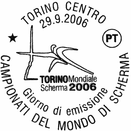 raffigura, su fondo rosso mattone, in primo piano due schermidori in azione e a sinistra il profilo stilizzato della Mole Antonelliana; in alto è riprodotto il logo dei Campionati Mondiali di Scherma. Completano il francobollo le leggende "CAMPIONATI DEL MONDO DI SCHERMA" e "TORINO 2006", la scritta "ITALIA" ed il valore "€ 0,65"