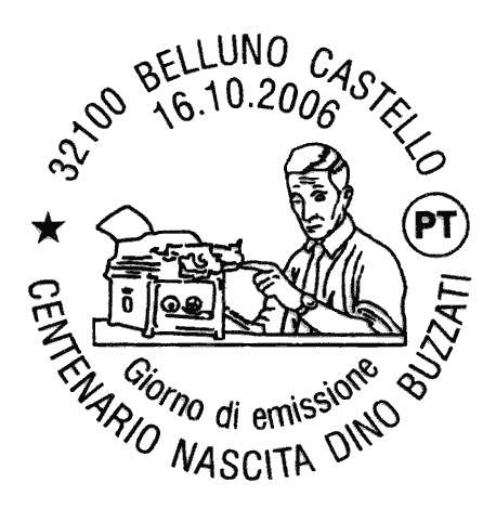 raffigura, entro una cornice grigia, un'immagine di Dino Buzzati intento a scrivere a macchina; due riquadri cromaticamente diversi evidenziano, rispettivamente, un particolare della macchina da scrivere e il volto dello scrittore. Completano il francobollo la leggenda "DINO BUZZATI", le date "1906 - 1972", la scritta "ITALIA" ed il valore "€ 0,60"