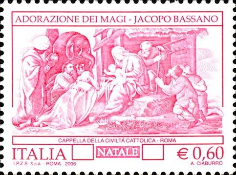riproduce, entro una cornice lineare, il dipinto "Adorazione dei Magi" di Jacopo Bassano, conservato nella Cappella della Civiltà Cattolica, in Roma. Completano il francobollo le leggende "ADORAZIONE DEI MAGI - JACOPO BASSANO", "CAPPELLA DELLA CIVILTÀ CATTOLICA - ROMA" e "NATALE", la scritta "ITALIA" ed il valore di "€ 0,60".