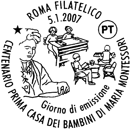 raffigura un ritratto della pedagogista Maria Montessori con una coppia di scolari di inizio Novecento e due alunni di oggi, rappresentativi della Casa dei Bambini fondata dall'educatrice nel 1907 a Roma; in alto a destra è riprodotto il logo del centenario della prima "Casa dei Bambini". Completano il francobollo la leggenda "CENTENARIO DELLA PRIMA "CASA DEI BAMBINI" DI MARIA MONTESSORI", la scritta "ITALIA" ed il valore "€ 0,60"