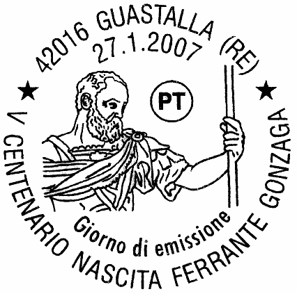 raffigura un particolare della statua denominata "Ferrante Gonzaga trionfante sull'invidia", realizzata dallo scultore Leone Leoni e collocata in una piazza del Comune di Guastalla. Completano il francobollo la leggenda "FERRANTE GONZAGA 1507-1557", la scritta "ITALIA" ed il valore "€ 1,00"
