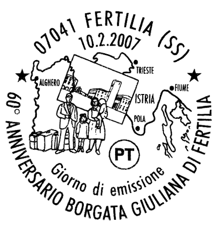 raffigura una famiglia di profughi in partenza e, sullo sfondo sovrapposti, il profilo della Regione Sardegna con indicata la città di Alghero, una cartolina d'epoca che raffigura la località di Fertilia e una cartina stilizzata della penisola d'Istria. Completano il francobollo la leggenda "60º ANNIVERSARIO DELLA BORGATA GIULIANA DI FERTILIA ALGHERO", la scritta "ITALIA" e il valore "€ 0,60".