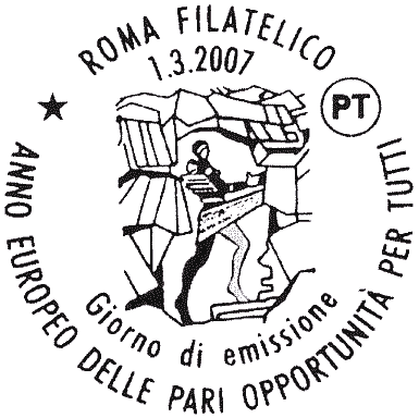 raffigura, in grafica stilizzata, una donna con bambino all'interno di una struttura architettonica sfaccettata. Completano il francobollo la leggenda "ANNO EUROPEO DELLE PARI OPPORTUNITÀ PER TUTTI", la scritta "ITALIA" e il valore "€ 0,60".