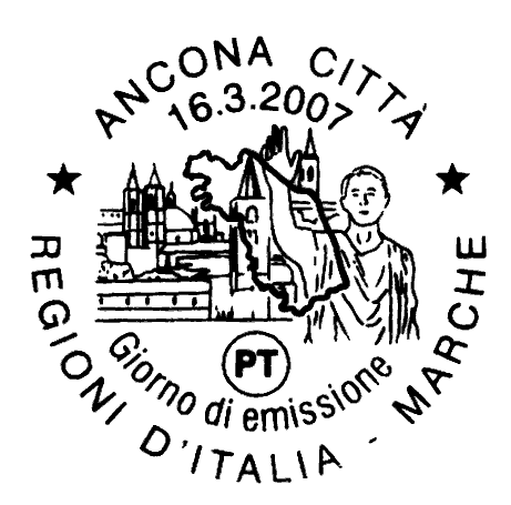 delimitato, in alto e a sinistra, da una fascia tricolore che riproduce all'interno di un occhiello lo stemma della relativa regione, e rappresenta le Marche: a sinistra una veduta di Ascoli Piceno, a destra un particolare dei "Bronzi dorati da Cartoceto di Pergola" raffigurante un cavaliere e al centro è delineato il profilo della Regione. Completano il francobollo la rispettiva leggenda: "MARCHE", la scritta "ITALIA" ed il valore "€ 0,60".