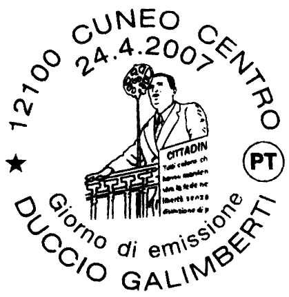 raffigura Duccio Galimberti ritratto a Cuneo il 26 luglio 1943 durante un suo discorso, le cui frasi più rappresentative sono parzialmente riportate in basso a destra. Completano il francobollo la leggenda "DUCCIO GALIMBERTI 1906-1944", la scritta "ITALIA" e il valore "€ 0,60".