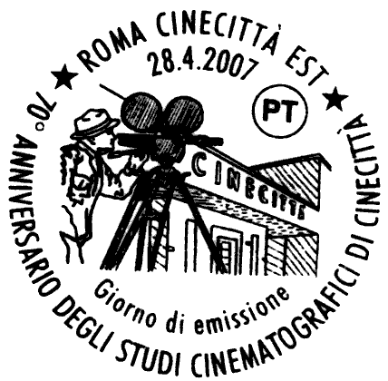 raffigura, in prospettiva, un particolare dell'ingresso della sede storica degli Studi Cinematografici, in Roma, dove è collocata l'insegna "CINECITTÀ"; in primo piano a sinistra è rappresentato un regista con una cinepresa. Completano il francobollo la leggenda "70º ANNIVERSARIO DEGLI STUDI CINEMATOGRAFICI", la scritta "ITALIA" e il valore "€ 0,65".