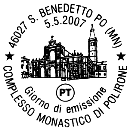 raffigura la facciata principale dell'abbazia del Complesso Monastico di Polirone, in San Benedetto Po, fondata nel 1007 da Tedaldo di Canossa. Completano il francobollo la leggenda "COMPLESSO MONASTICO DI POLIRONE - SAN BENEDETTO PO", la scritta "ITALIA" e il valore "€ 0,60".