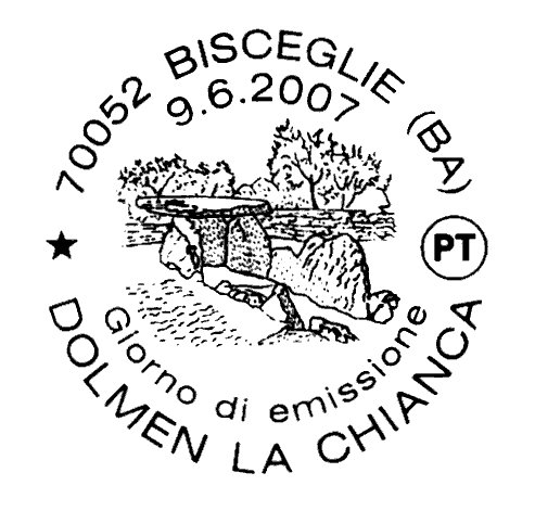raffigura il Dolmen la Chianca, reperto funerario risalente all'età del bronzo, costruito con lastroni di pietra e situato presso la città di Bisceglie. Completano il francobollo le leggende "DOLMEN LA CHIANCA" e "BISCEGLIE", la scritta "ITALIA" e il valore "€ 0,60".