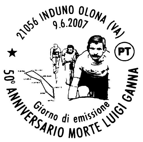 raffigura, in primo piano, Luigi Ganna durante una gara inseguito da due corridori; in alto è riportato il percorso che indica le tappe del primo Giro d'Italia del 1909, vinto dal ciclista italiano. Completano il francobollo la leggenda "LUIGI GANNA" e le date "1883-1957", la scritta "ITALIA" e il valore "€ 0,60".