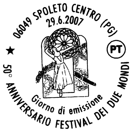 raffigura, in primo piano, una danzatrice e alle sue spalle un disegno che rappresenta il rosone centrale del Duomo di Spoleto, ripetuto più volte sul francobollo; sullo sfondo è riportato un particolare del Ponte delle Torri, in Spoleto, tra i cui archi si snoda un pentagramma con delle note musicali. Completano il francobollo la leggenda "50º ANNIVERSARIO FESTIVAL DEI DUE MONDI ", la scritta "ITALIA" e il valore "€ 0,60".