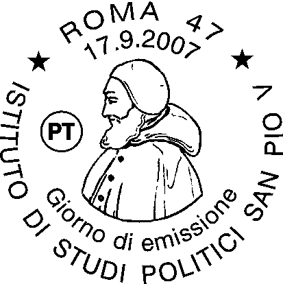 dedicato all'Istituto di Studi Politici "S. Pio V" riproduce il logo dell'Istituto con la scritta "ISTITUTO DI STUDI POLITICI SAN PIO V ROMA", posto su un fondo color arancio che sfuma nel giallo, tracciato da linee orizzontali parallele. Completano il francobollo la scritta "ITALIA" ed il valore di "€ 0,60".