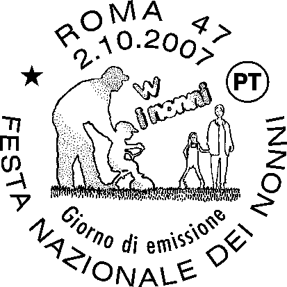 rappresenta, in grafica stilizzata, un nonno nell'atto di sospingere il nipotino sul triciclo e, in secondo piano, una nonna che accompagna la nipotina sui pattini a rotelle. Al centro è riportata la scritta "W I NONNI". Completano il francobollo la leggenda "FESTA NAZIONALE DEI NONNI", la scritta "ITALIA" e il valore "€ 0,60".