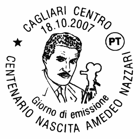 raffigura un ritratto di Amedeo Nazzari, la sagoma di una cinepresa e, sullo sfondo, l'attore nelle vesti di un personaggio da lui interpretato. Completano ciascun francobollo la rispettiva leggenda "AMEDEO NAZZARI 1907-1979", la scritta "ITALIA" ed il valore "€ 0,60".