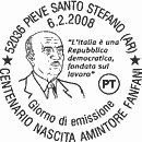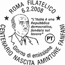 | Vignetta | raffigura, a sinistra, il ritratto dello statista Amintore Fanfani e, a destra, il testo del primo articolo della Costituzione della Repubblica Italiana che recita: "L'Italia è una Repubblica democratica, fondata sul lavoro". Completano il francobollo la leggenda "AMINTORE FANFANI", le date "1908 - 1999", la scritta "ITALIA" ed il valore "€ 1,00". |