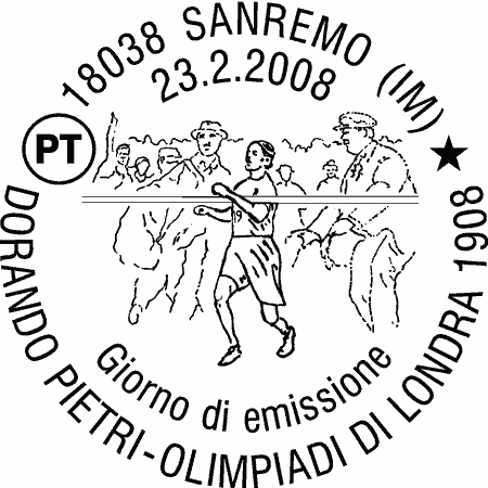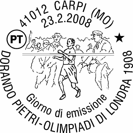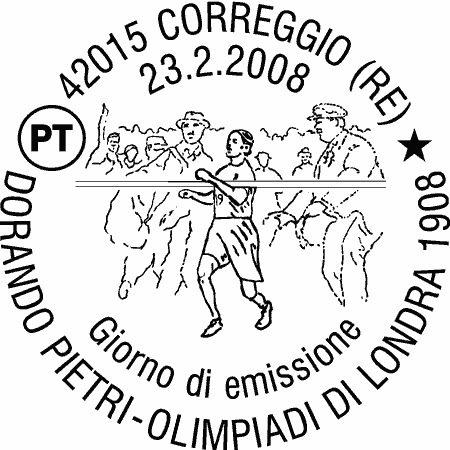 | Vignetta | Il francobollo raffigura l'immagine dell'atleta Dorando Pietri sul traguardo della maratona alle Olimpiadi di Londra del 1908. Completano il francobollo le leggende "DORANDO PIETRI 1885 - 1942" e "OLIMPIADI DI LONDRA 1908", la scritta "ITALIA" ed il valore "€ 0,60". |