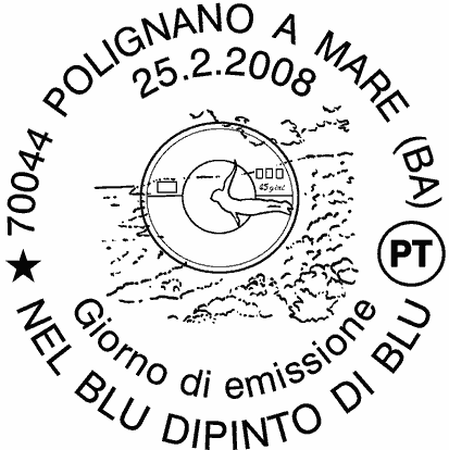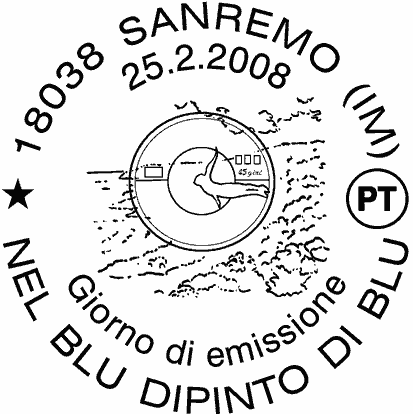 | Vignetta | Il francobollo rappresenta, in grafica stilizzata, un disco in vinile ed una figura che si libra in aria. Completano il francobollo le leggende "NEL BLU, DIPINTO DI BLU" e "45 GIRI", la scritta "ITALIA" ed il valore "€ 0,60". |