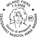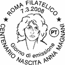 | Vignetta | Il francobollo raffigura un intenso ritratto di Anna Magnani, attrice italiana e icona del cinema internazionale, vincitrice del Premio Oscar nel 1956. Completano il francobollo la leggenda "ANNA MAGNANI 1908 - 1973", la scritta "ITALIA" ed il valore "€ 0,60". |