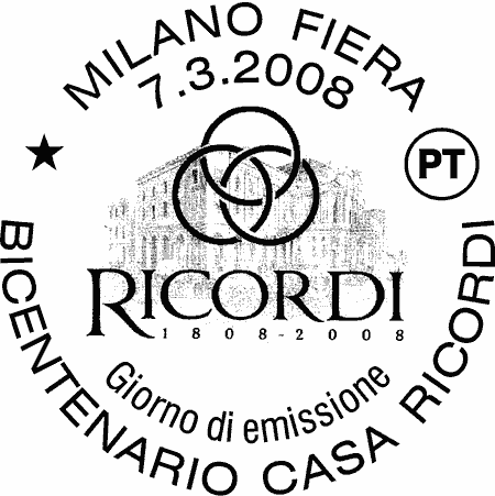 | Vignetta | Il francobollo riproduce, in primo piano, il logo realizzato in occasione del bicentenario della fondazione di Casa Ricordi; sullo sfondo è raffigurato l'edificio del Teatro alla Scala di Milano che ospitava la sede storica del negozio della Casa editrice. Completano il francobollo la scritta "ITALIA" ed il valore "€ 0,60". |