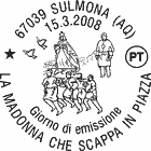 | Vignetta | raffigura una scena della sacra rappresentazione "La Madonna che scappa in piazza", che si svolge la domenica di Pasqua a Sulmona e, in alto a sinistra, due colombe che si librano in volo; in alto a destra è ritratto un confratello laureano in mozzetta verde e tunica bianca. Completano il francobollo le leggende "SULMONA" e "LA MADONNA CHE SCAPPA IN PIAZZA", la scritta "ITALIA" ed il valore "€ 0,60". |
